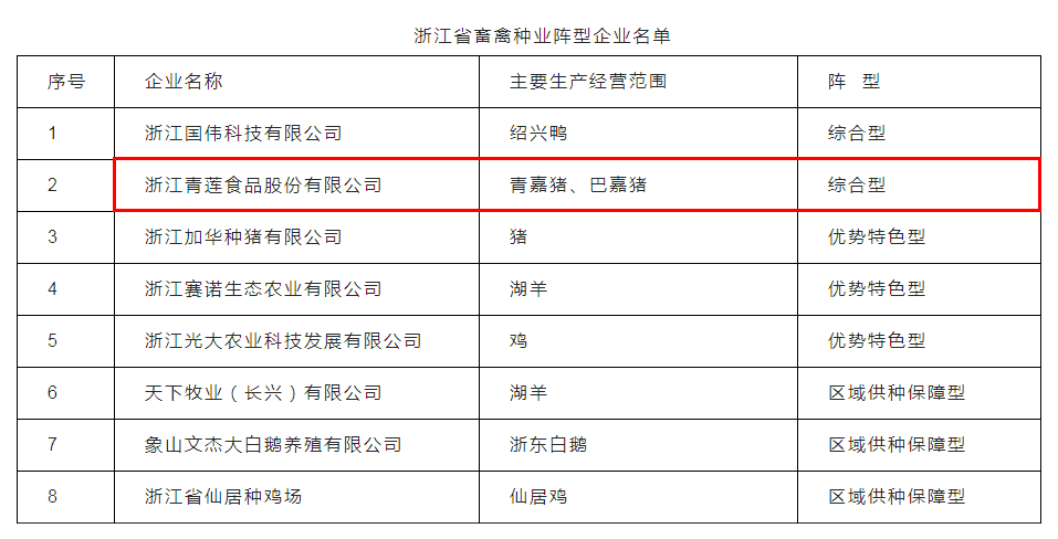 914浙江省農業農村廳浙江省科學技術廳公布浙江省種業陣型企業名單,其中浙江青蓮食品股份有限公司認定為畜禽種業綜合性陣型企業